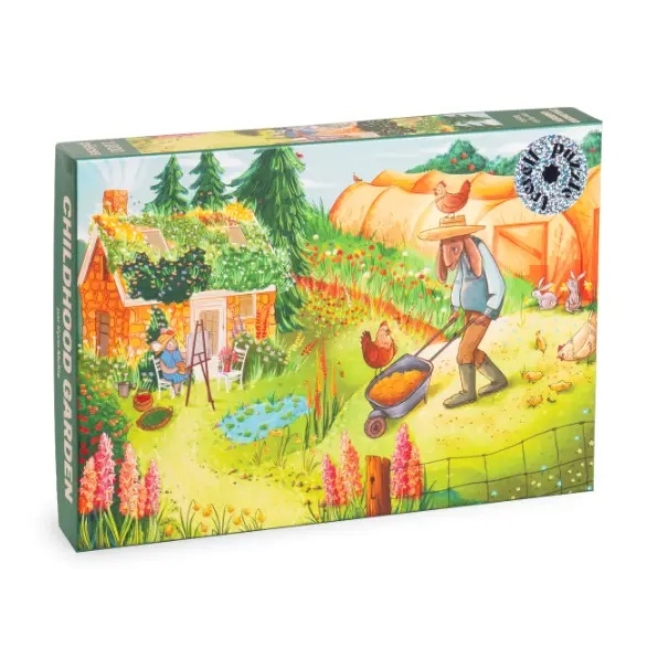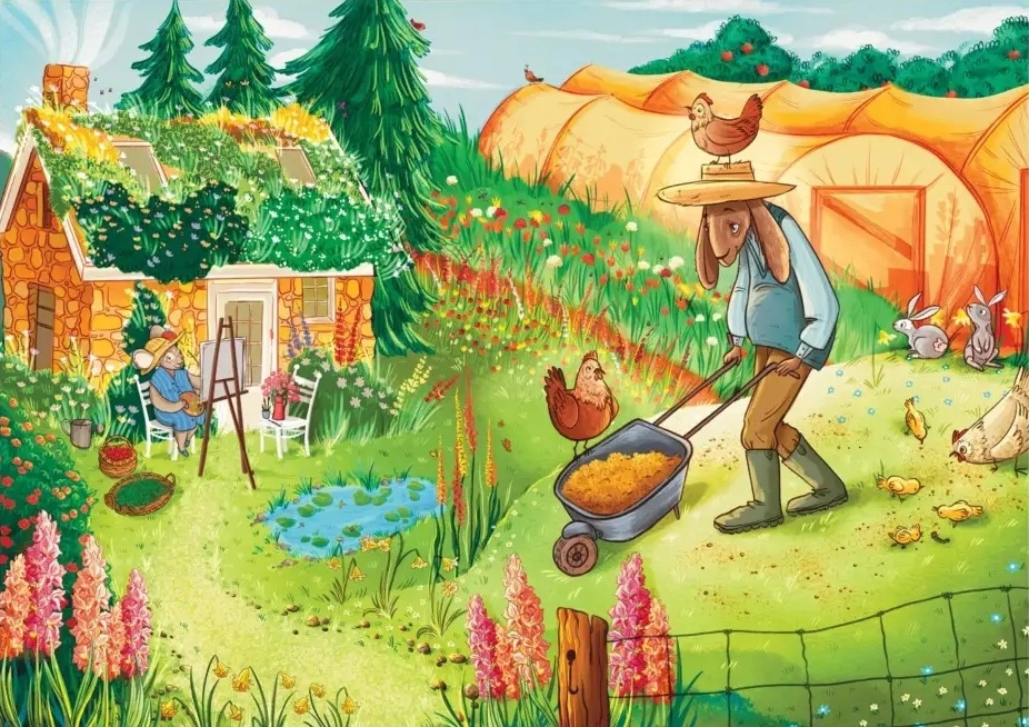 Trevell legpuzzel van 1000 stukjes met op de puzzel een tuin waar een muisje aan het schilderen is en een haas de kippen aan het voeren is. Afmetingen puzzel: 68,5 x 48 cm, poster bijgesloten.