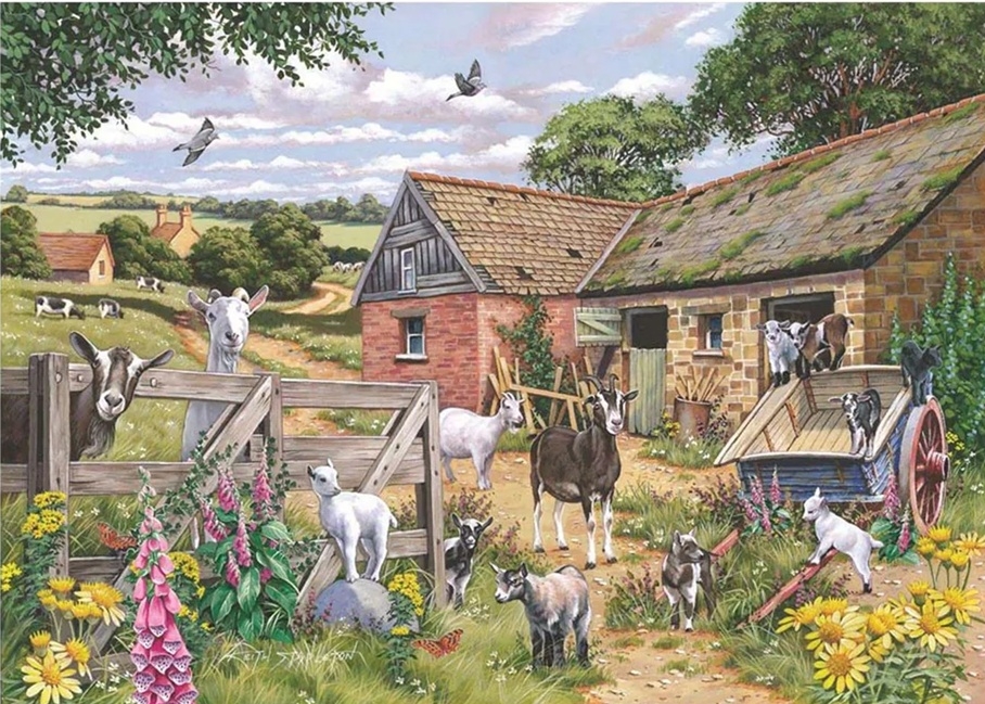 House of Puzzles legpuzzel van 500 grotere stukjes met op de puzzel een boerderij vol geiten en baby-geitjes, artiest Keith Stapleton. Afmetingen puzzel: 69 x 48 cm.