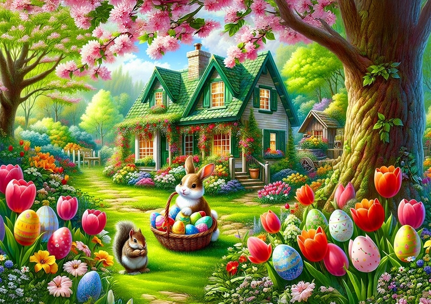 Art Puzzle van 260 grotere stukjes met op de puzzel een tuin waar kleurrijke paaseieren verstopt zijn. Afmetingen puzzel: 48 x 34 cm.