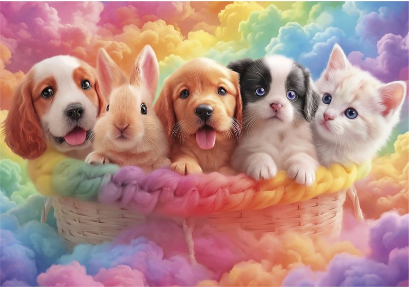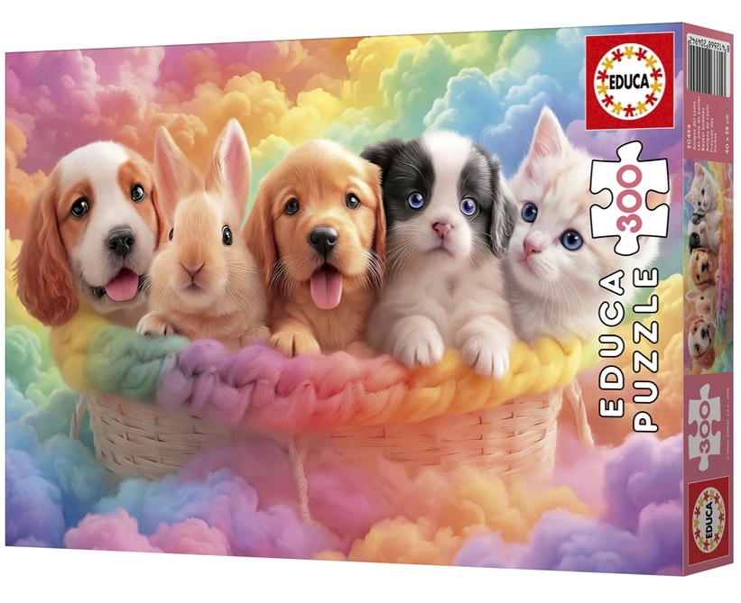 Educa legpuzzel van 300 grotere stukjes met op de puzzel een mand vol met hondjes, een konijntje en een katje. Afmetingen puzzel: 40 x 28 cm.