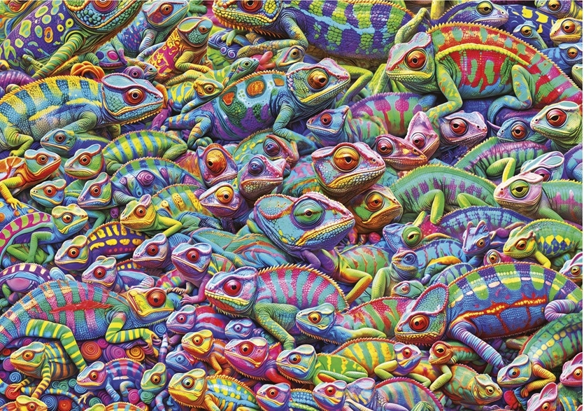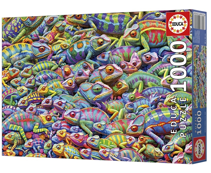Educa legpuzzel van 1000 stukjes met op de puzzel een chaos van gekleurde cameleons. Afmetingen puzzel: 68 x 48 cm.