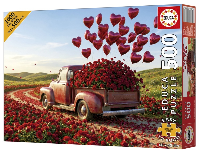 Educa legpuzzel van 500 grotere stukjes met op de puzzel een pickup truck afgeladen met rode rozen op weg naar geliefdes op Valentijnsdag. Afmetingen puzzel: 68 x 48 cm.