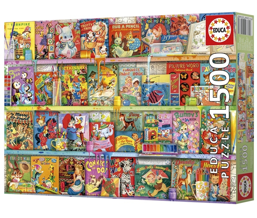 Educa legpuzzel van 1500 stukjes met op de puzzel een boekenkast vol leuke kinderboekjes, artiest Aimee Stewart. Afmetingen puzzel: 85 x 60 cm.