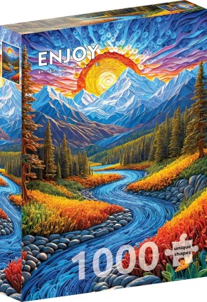 Enjoy Puzzle verticale puzzel van 1000 stukjes met op de puzzel een kleurrijke zonsopkomst boven een landschap vol bergen. Afmetingen puzzel: 48 x 68 cm.