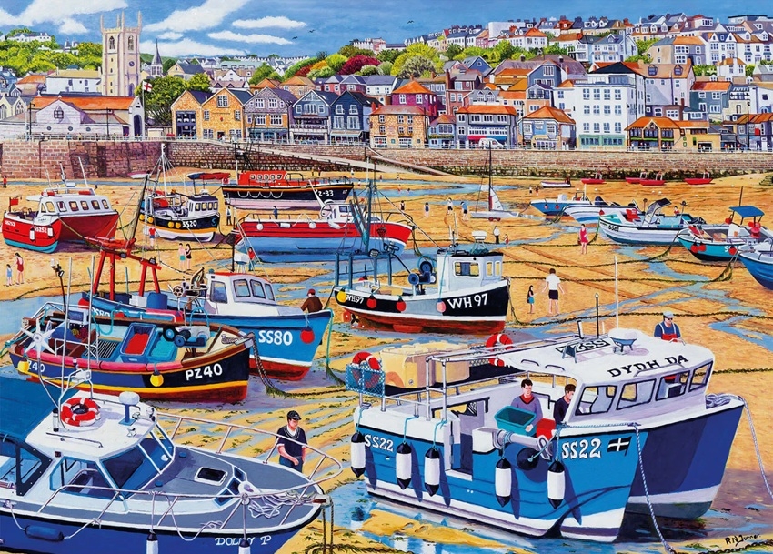Gibsons legpuzzel van 1000 stukjes met op de puzzel het zand van het weggetrokken water in de haven van Sint Ives in Engeland. Afmetingen puzzel: 68 x 49 cm, artiest Roger Neil Turner.