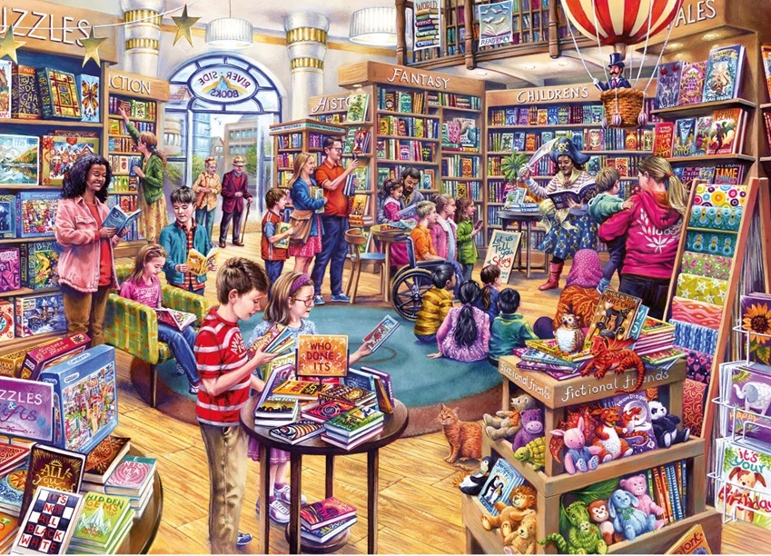 Gibsons legpuzzel van 1000 stukjes met op de puzzel een grote boekenwinkel vol met klanten die de nieuwste boeken inkijken. Afmetingen puzzel: 68 x 49 cm, artiest Tony Ryan.