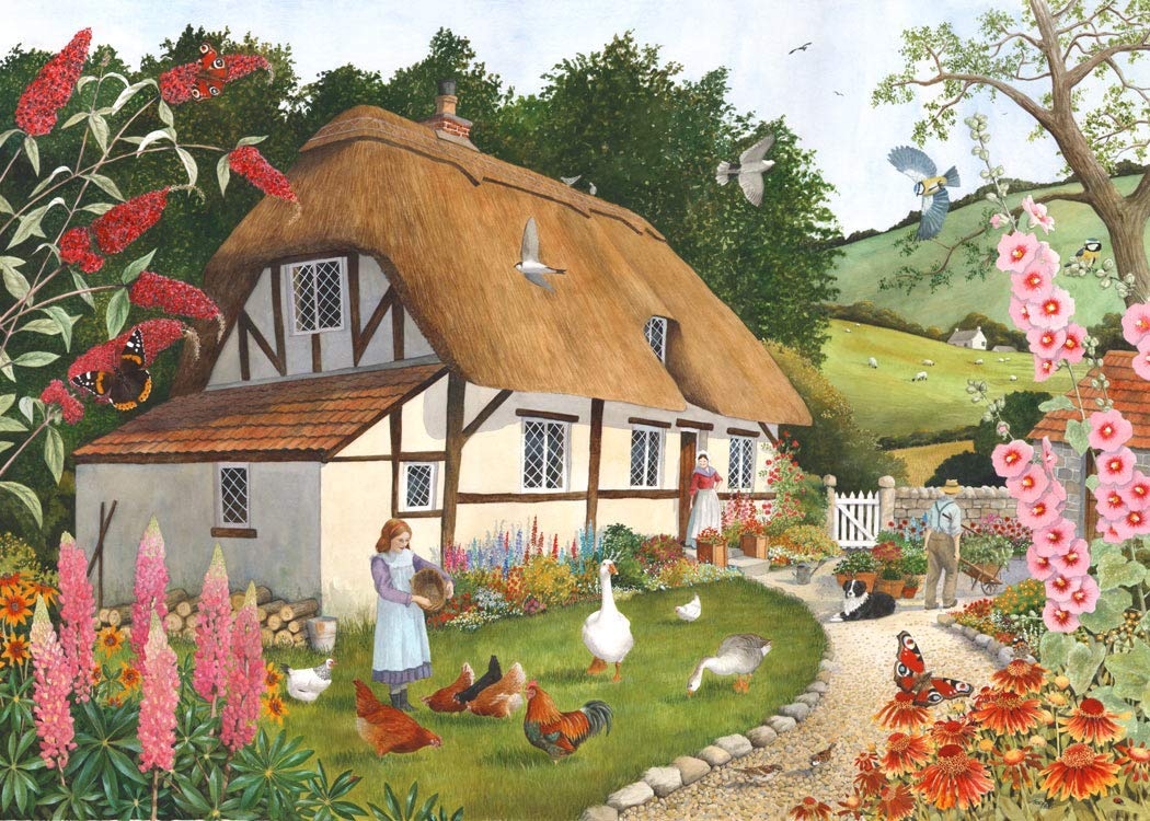 House of Puzzles legpuzzel van 500 grotere stukjes met op de puzzel een prachtige boerderij met een rieten dak en een mooie tuin eromheen. Afmetingen puzzel: 69 x 48 cm, puzzel met ongelijkmatige stukjes.