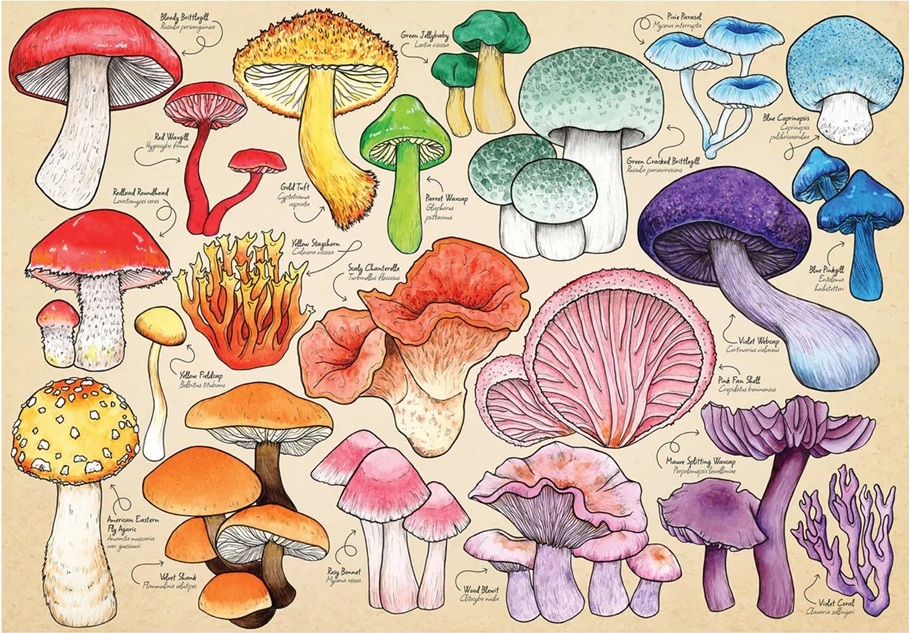 House of Puzzles minipuzzel van 150 stukjes met op de puzzel kleurrijke paddenstoelen en hun Engelse namen. Afmetingen puzzel: 15 x 10 cm.