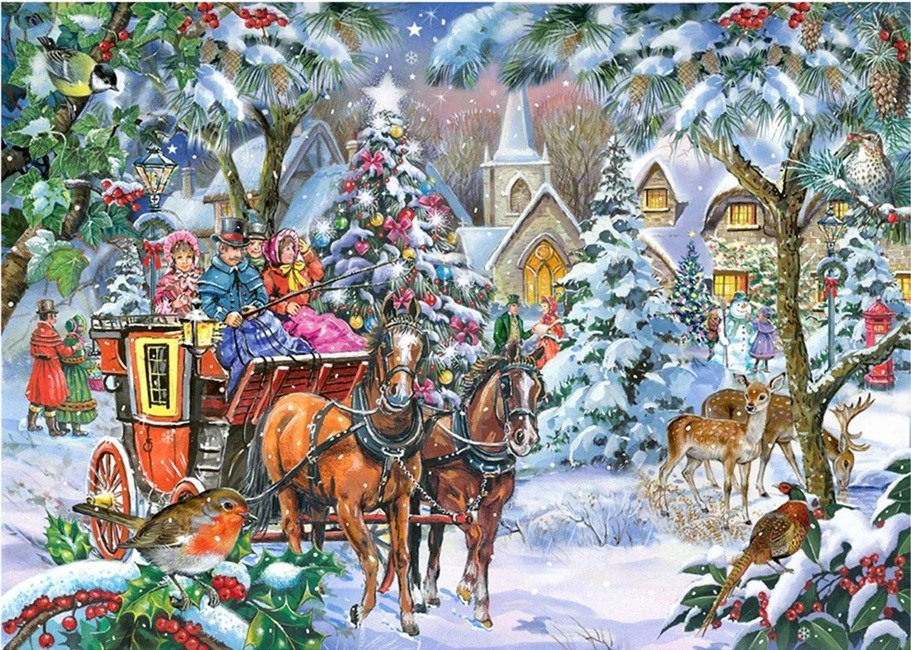 House of Puzzles legpuzzel van 1000 stukjes met op de puzzel een dorpje in de winter waar paard en wagen de sneeuw trotseert, artiest Robert Barry. Afmetingen puzzel: 68 x 48 cm, ongelijkmatige stukjes.