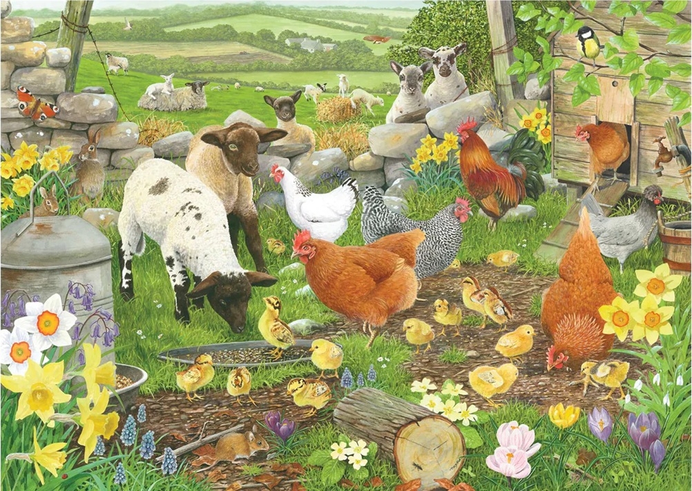 House of Puzzles legpuzzel van 250 grote stukjes uit de serie The Darley Collection van artiest Keith Stapleton. De kuikentjes scharrelen lekker rond in de tuin van een boerderij.
