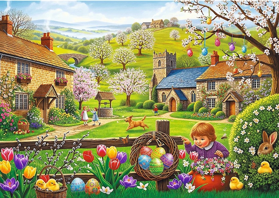 Trefl legpuzzel van 1000 stukjes met op de puzzel een lentedag waar kinderen op zoek zijn naar paaseieren in de tuin. Afmetingen puzzel: 68 x 48 cm.