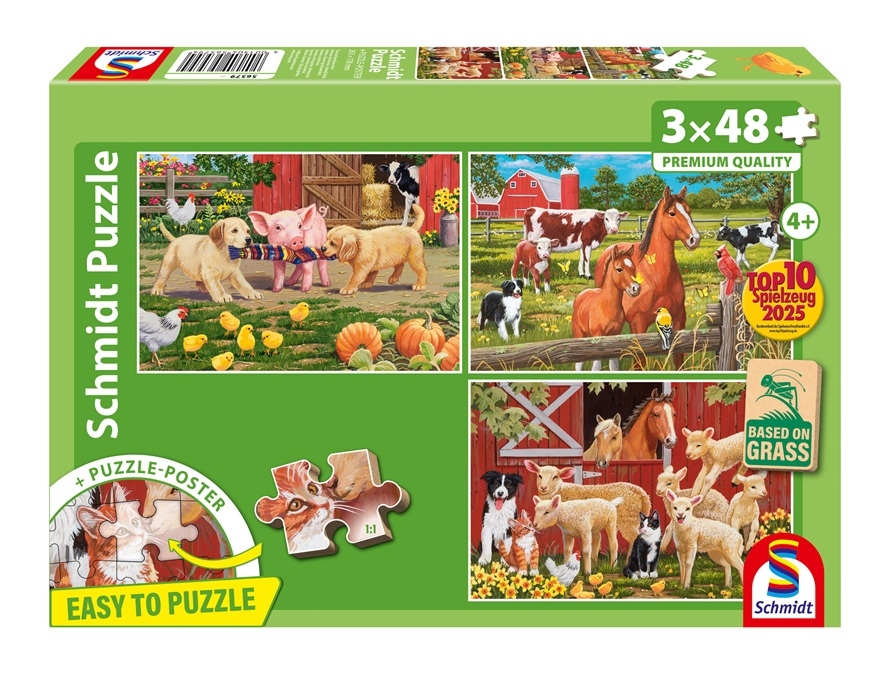 Schmidt kinderpuzzels, 3 puzzels van 48 stukjes met op elke puzzel schattige boerderijdieren. Afmetingen per puzzel: 26 x 18 cm, voor kinderen vanaf 4 jaar.