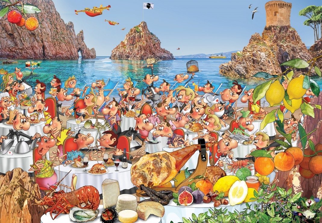Grafika legpuzzel van 1000 stukjes met op de puzzel het Franse eiland Corsica waar mensen op een terras van een restaurant genieten van het mooie weer en het eten, artiest Francois Ruyer. Afmetingen puzzel: 69 x 48 cm.