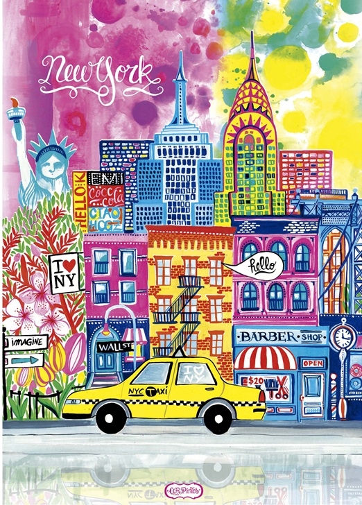 Educa verticale legpuzzel van 1000 stukjes met op de puzzel de huizen en gebouwen in New York, artiest Car Pintos. Afmetingen puzzel: 48 x 68 cm.