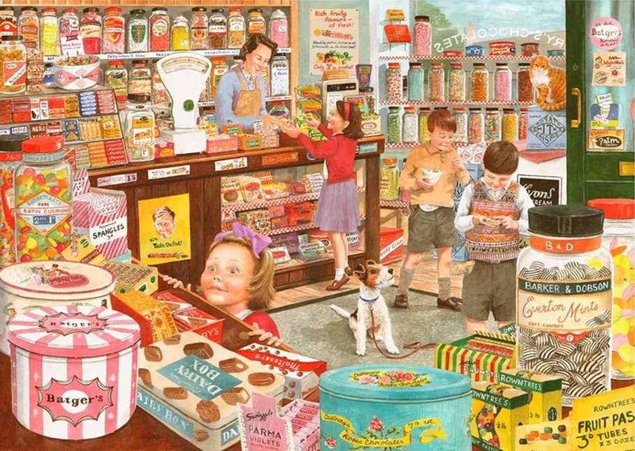 House of Puzzles legpuzzel van 500 grotere stukjes met op de puzzel een snoepwinkeltje waar kinderen hun ogen uitkijken, artiest Tracy Hall Afmetingen puzzel: 69 x 48 cm, puzzel met ongelijkmatige stukjes.