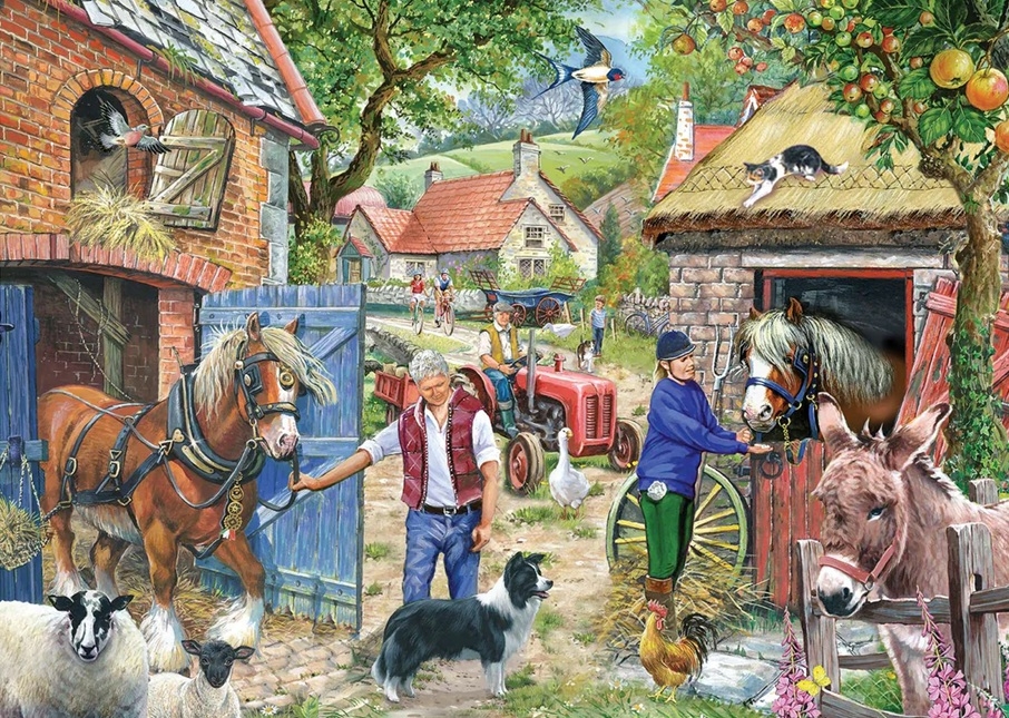 House of Puzzles legpuzzel van 500 grotere stukjes met op de puzzel een boerderij waar de paarden klaargemaakt worden voor een lekker ritje, artiest Robert Barry. Afmetingen puzzel: 69 x 48 cm, puzzel met ongelijkmatige stukjes.
