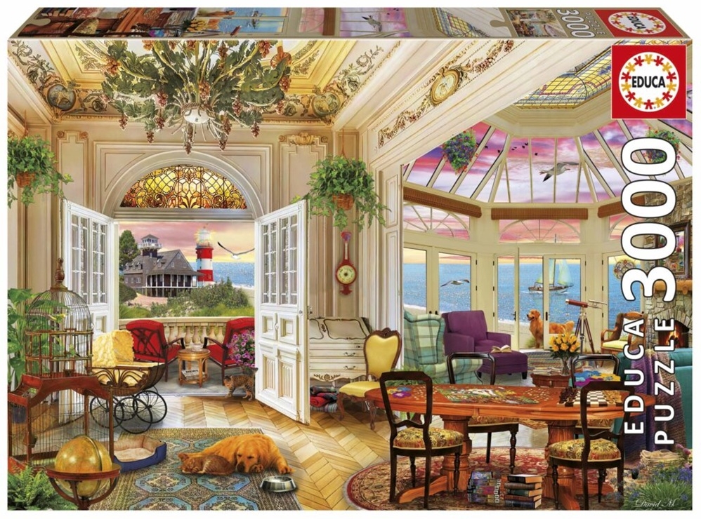 Educa legpuzzel van 3000 stukjes met op de puzzel een prachtig huis met uitzicht over zee en een vuurtoren, artiest David Maclean. Afmetingen puzzel: 120 x 85 cm.