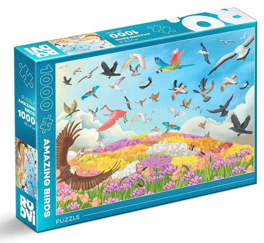 Roovi legpuzzel van 1000 stukjes met op de puzzel een weide vol bloemen waar vele verschillende vogels leven. Afmetingen puzzel: 68 x 47 cm.