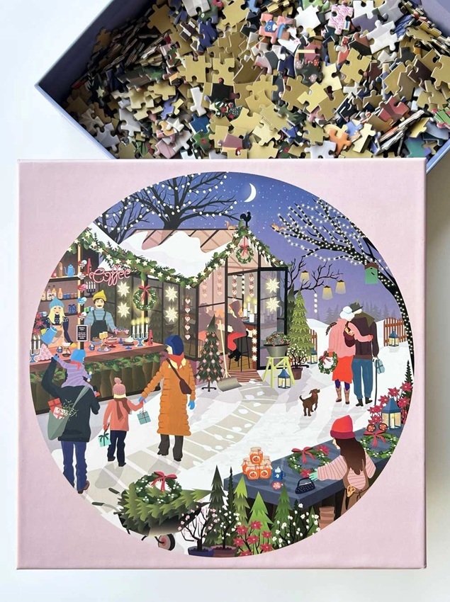 Vissevasse legpuzzel van 1000 stukjes met op de puzzel een winterse avond waar mensen naar een gezellige kerstmarkt gaan. Afmetingen puzzel: 65 x 65 cm, ronde puzzel.