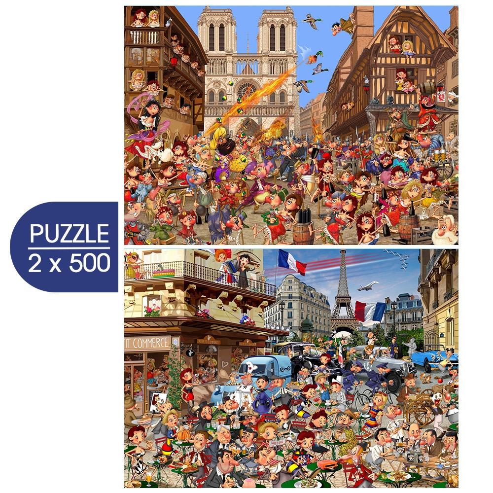 Grafika 2 legpuzzels van 500 stukjes van Francois Ruyer met op de puzzels La Cour des Miracles en Les 30 Glorieuses. Afmetingen per puzzel: 48 x34 cm.