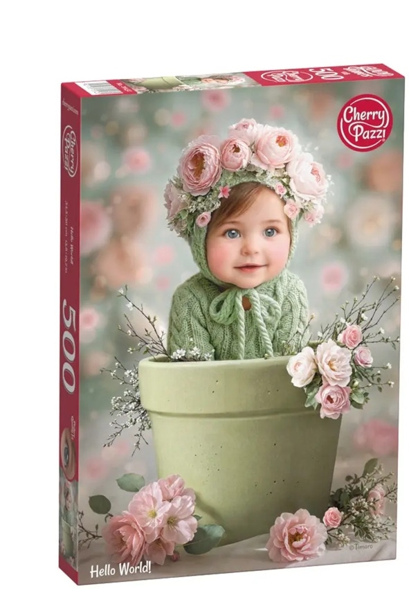 Cherry Pazzi legpuzzel van 500 stukjes met op de puzzel een schattig kindje in een bloempot. Afmetingen puzzel: 34,5 x 50 cm.