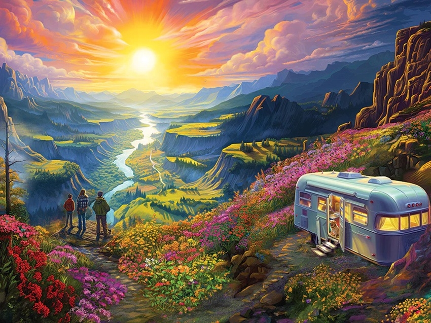 Cobble Hill legpuzzel van 275 grote stukjes uit de Easy Handling serie met op de puzzel een caravan die op een prachtige plek in de bergen staat. Afmetingen puzzel: 61 x 46 cm, puzzels met gekke puzzelstukjes, poster bijgesloten.