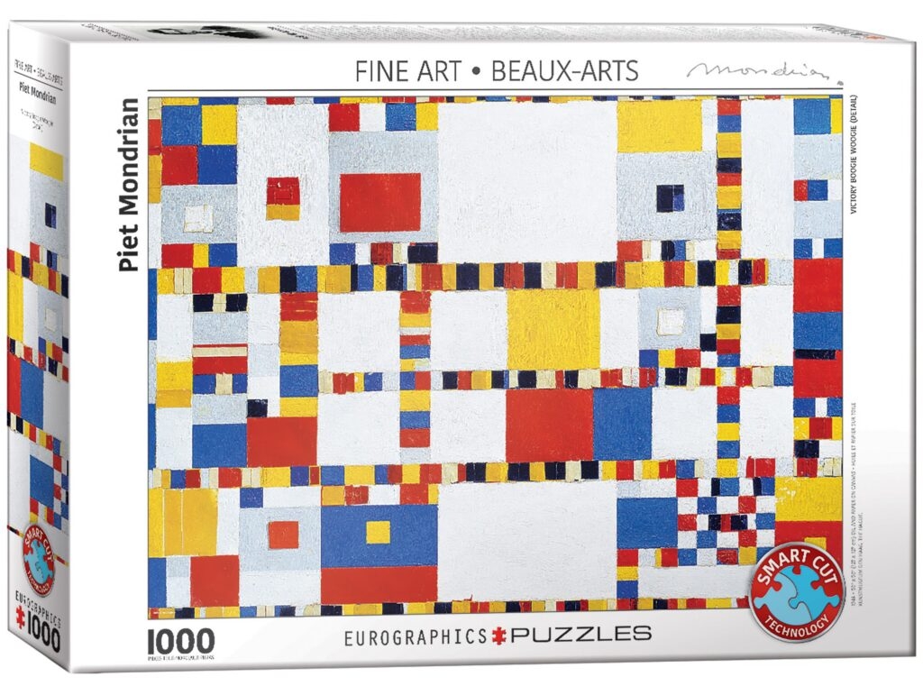 Eurographics legpuzzel van 1000 stukjes uit The Art Collection met op de puzzel een detail van het werk Victory Boogie Woogie van Piet Mondriaan. Afmetingen puzzel: 68 x 48 cm, Smart Cut puzzelstukjes.