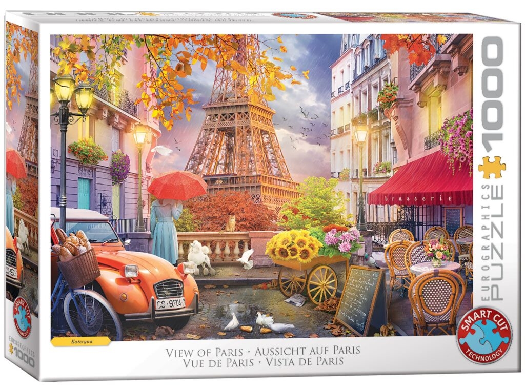 Eurographics legpuzzel van 1000 stukjes met op de puzzel een prachtig uitzicht op de Eiffeltoren vanuit een straatje in Parijs, artiest Kateryna. Afmetingen puzzel: 68 x 48 cm, Smart Cut Technology puzzelstukjes.
