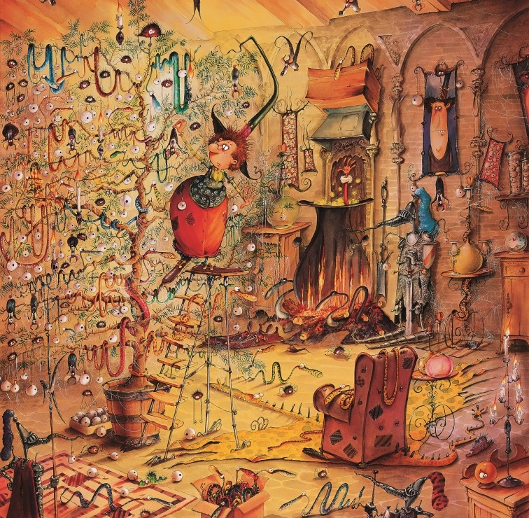 Grafika vierkante legpuzzel van 1024 stukjes met op de puzzel een heks die in haar bijzondere kerstboom aan het optuigen is, artiest Francois Ruyer. Afmetingen puzzel: 63,5 x 63,5 cm.
