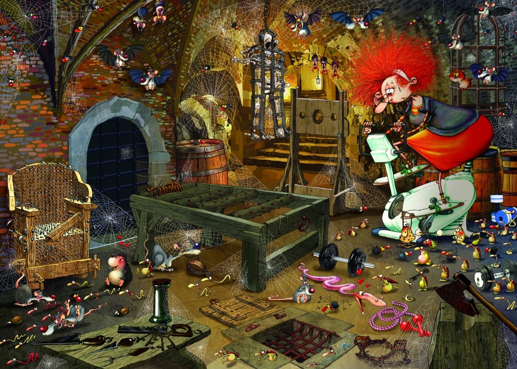 Grafika legpuzzel van 500 stukjes van Francois Ruyer met op de puzzel een heks die aan sporten is in haar eigen sportkamer. Afmetingen puzzel: 48 x 34 cm.