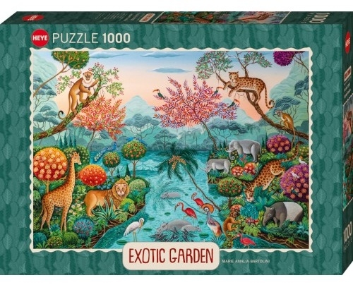 Heye legpuzzel van 1000 stukjes uit de Exotic Garden serie met op de puzzel een lagune vol planten en wilde dieren, artiest Marie Amalia Bartolini. Afmetingen puzzel: 70 x 50 cm.