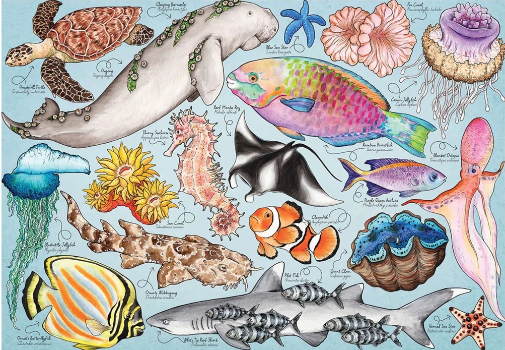 House of Puzzles legpuzzel van 1000 stukjes met op de puzzel de vissen die je in de Great Barrier Reef kunt vinden, artiest Mirri Rowland. Afmetingen puzzel: 68 x 48 cm, ongelijkmatige stukjes.