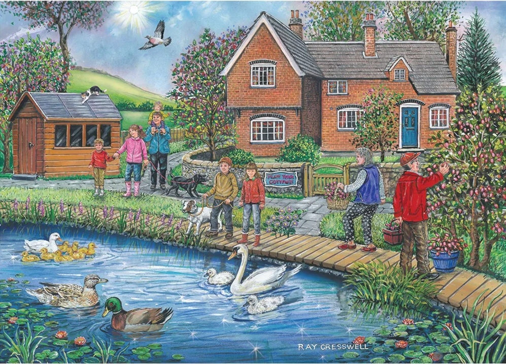 House of Puzzles legpuzzel van 250 grotere stukjes met op de puzzel een huisje aan de rand van een riviertje waar de eenden en zwanen brood gevoerd krijgen, artiest Ray Cresswell. Afmetingen puzzel: 48 x 34 cm.