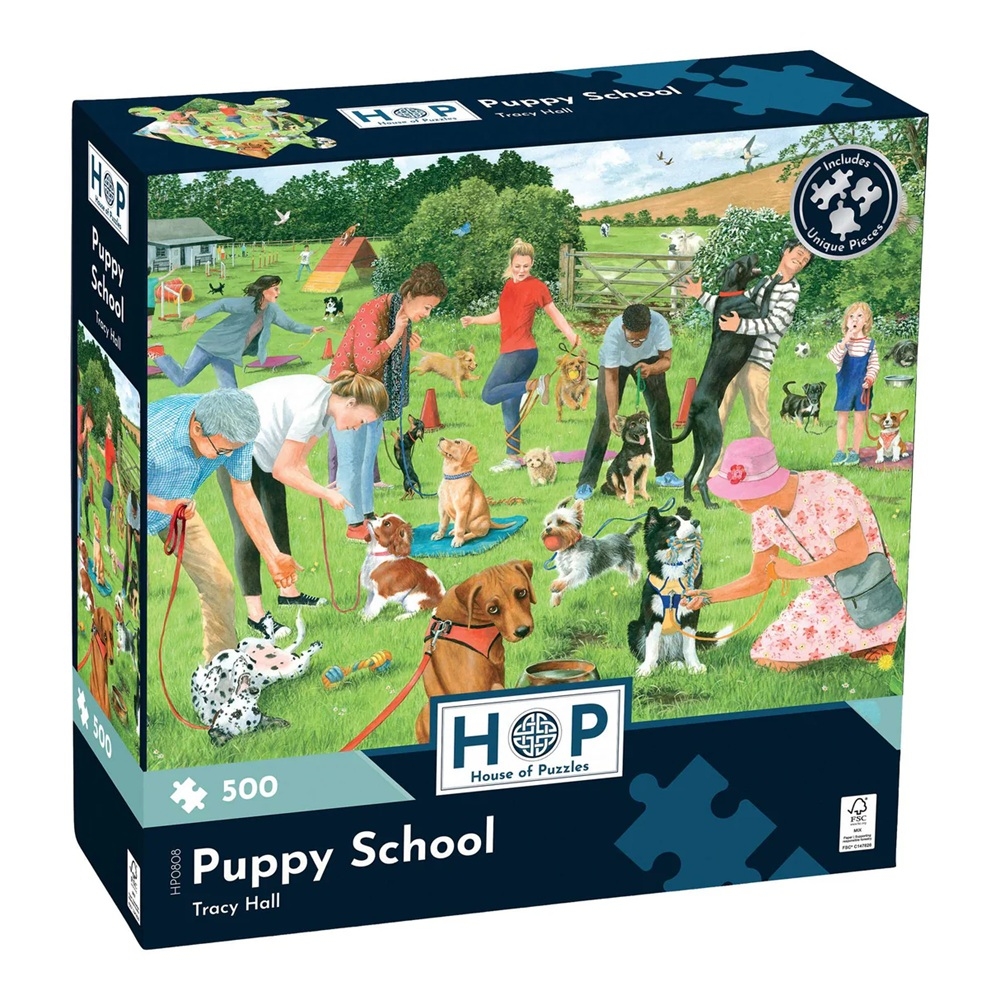House of Puzzles legpuzzel van 500 stukjes met op de puzzel een hondenschool, artiest Tracy Hall. Afmetingen puzzel: 48 x 34 cm.