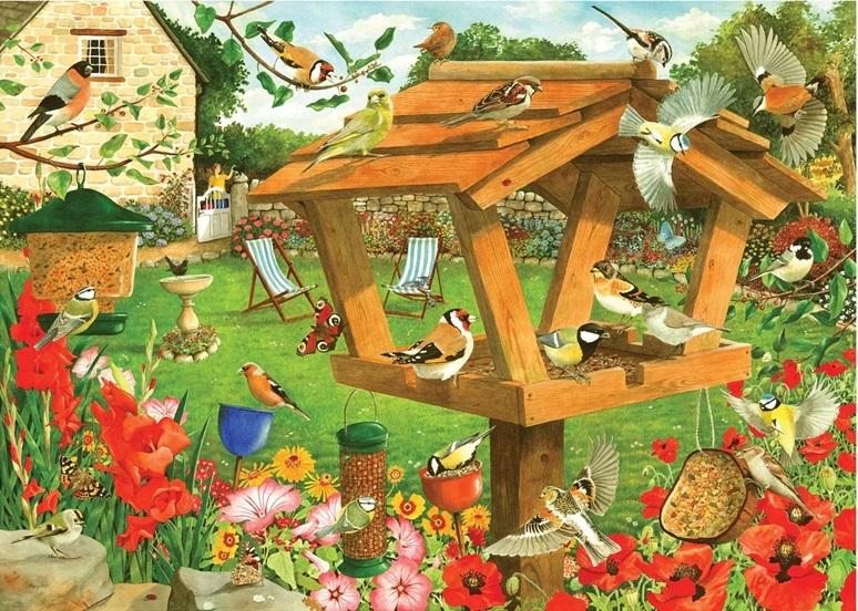 House of Puzzles legpuzzel van 250 grotere stukjes met op de puzzel een herfsttuin waar vogeltjes komen eten bij een vogelvoederhuisje, artiest Tracy Hall. Afmetingen puzzel: 48 x 34 cm.