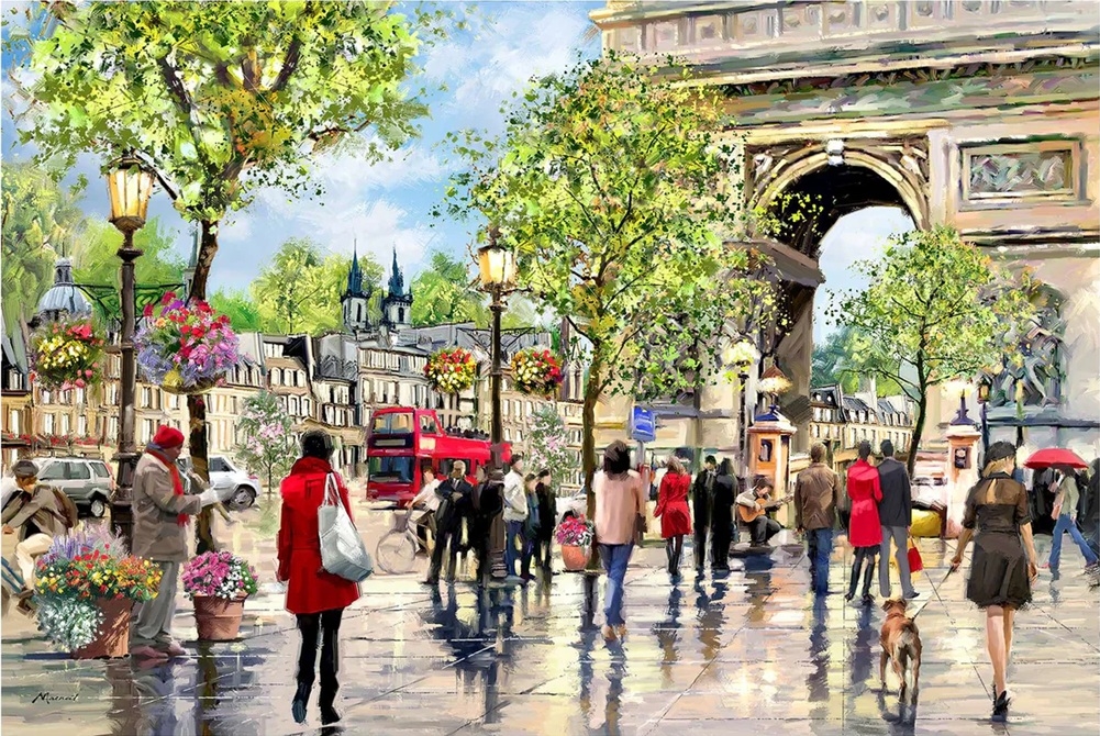 House of Puzzles legpuzzel van 500 grotere stukjes met op de puzzel een regenachtige dag bij de Arc de Triomph, artiest Richard Macneil. Afmetingen puzzel: 69 x 48 cm, puzzel met ongelijkmatige stukjes.