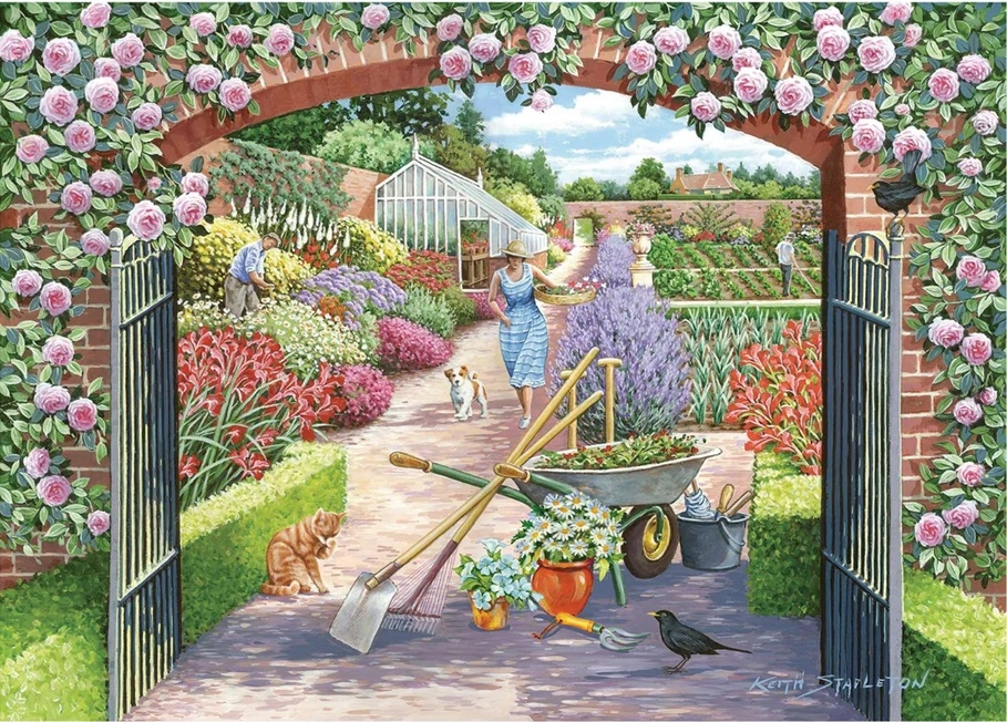 House of Puzzles legpuzzel van 250 grotere stukjes met op de puzzel een prachtige tuin vol bloemen en omringt met een stenen muur, artiest Keith Stapleton. Afmetingen puzzel: 48 x 34 cm.