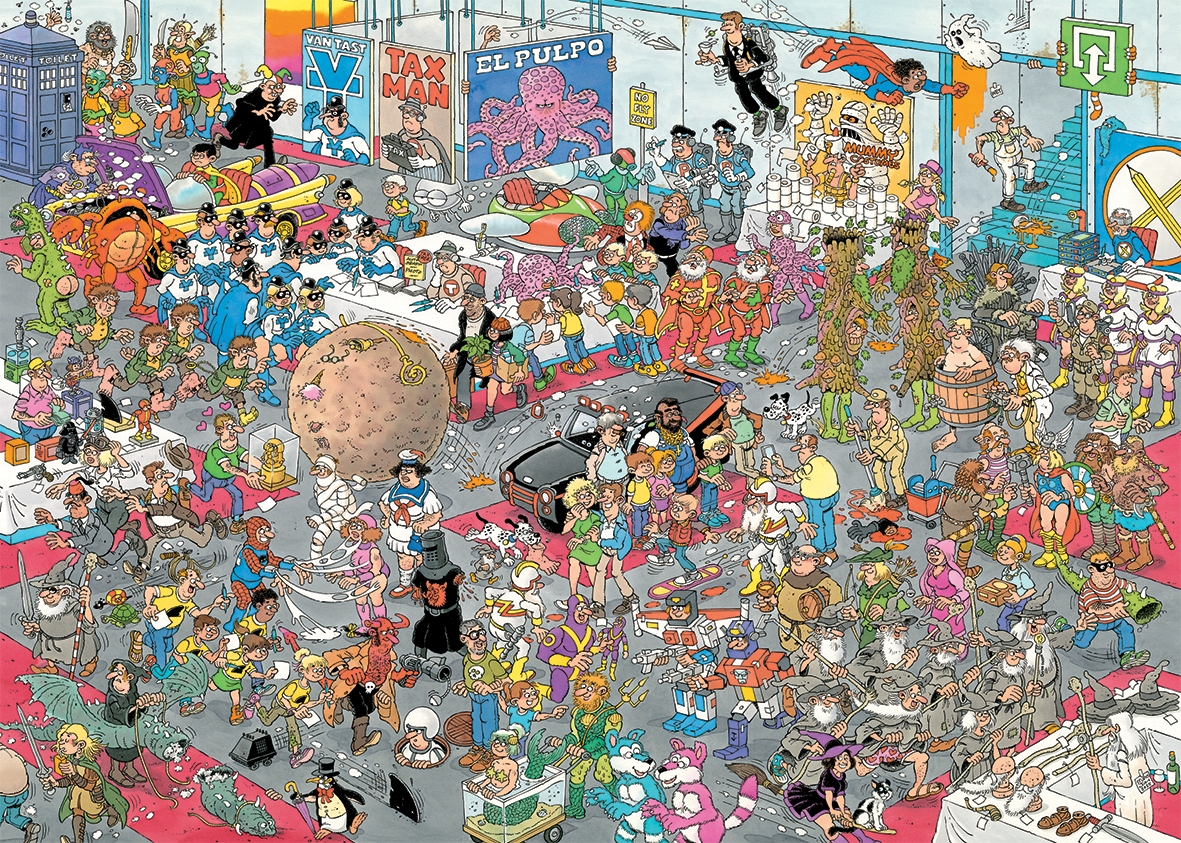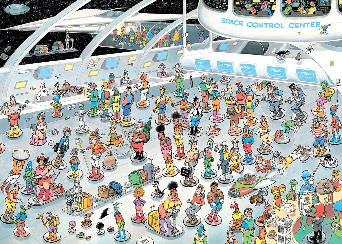 Jan van Haasteren twee legpuzzels van 1000 stukjes met op de puzzel een drukke vertrekhal in de ruimte en een filmbeurs waar je ook veel figuren uit films ziet. Afmetingen per puzzel: 68 x 49 cm, uitgave november 2025.
