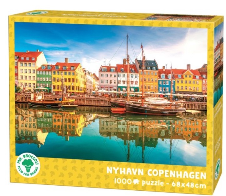 Mr Broccoli legpuzzel van 1000 stukjes met op de puzzel een uitkijk over de kleurrijke haven van Kopenhagen. Afmetingen puzzel: 68 x 48 cm.