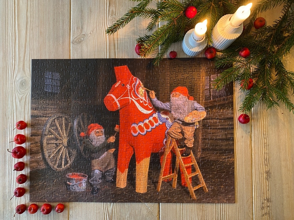 Penny Puzzle legpuzzel van 500 stukjes met op de puzzel hulpjes van de Kerstman die een New Dala Horse aan het verven zijn. Afmetingen puzzel: 48 x 34 cm.
