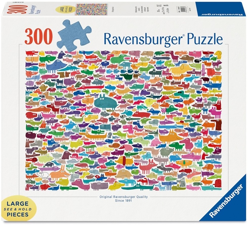 Ravensburger legpuzzel van 300 extra grote puzzelstukken met op de puzzel 387 kleurrijke hondjes en 1 kat. Afmetingen puzzel: 70 x 50 cm, artiest Nicolas Gouny.