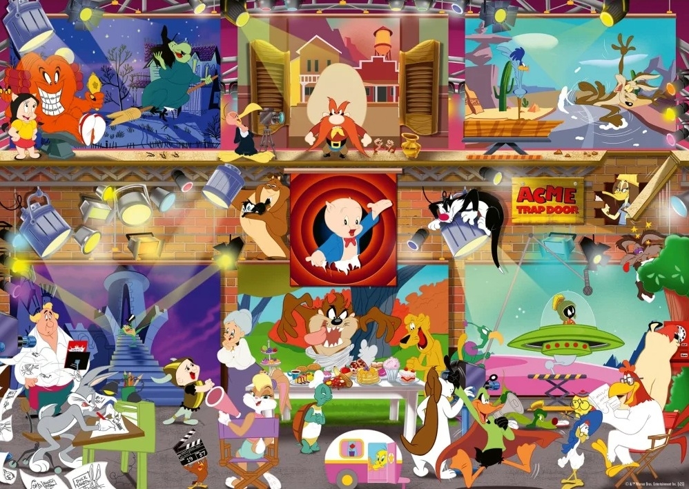 Ravensburger legpuzzel van 1000 stukjes met op de puzzel de studio van Looney Tunes met alle bekende karakters. Afmetingen puzzel: 70 x 50 cm, 1008 puzzelstukjes.