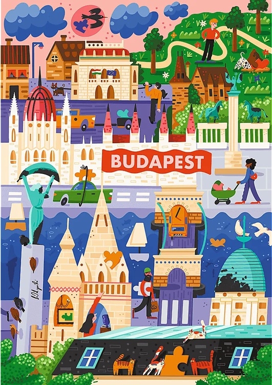 Trefl verticale puzzel van 1000 stukjes met op de puzzel bekende gebouwen die je in Budapest kunt vinden, artiest Adrian Wilczynski. Afmetingen puzzel: 48 x 68 cm.